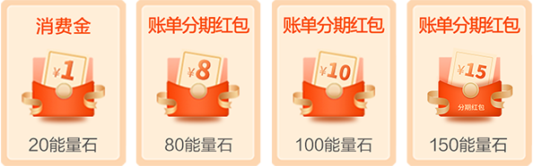 任务主题 任务条件及奖励 办分期 办理分期得20能量石,每月1次 自动还款 完成设置,每月自扣成功一笔 支付宝消费 单笔消费满10元领5能量石,每月6次 微信消费 单笔消费满10元领5能量石,每月6次 抖音支付消费 单笔消费满10元领5能量石,每月6次 多多支付消费 单笔消费满10元领5能量石,每月6次 生活缴费 单笔缴费满10元领10能量石,每月1次 商城购物 交易1笔得5能量石,每月1次 开启通知权限 开启通知权限领10能量石,每月1次