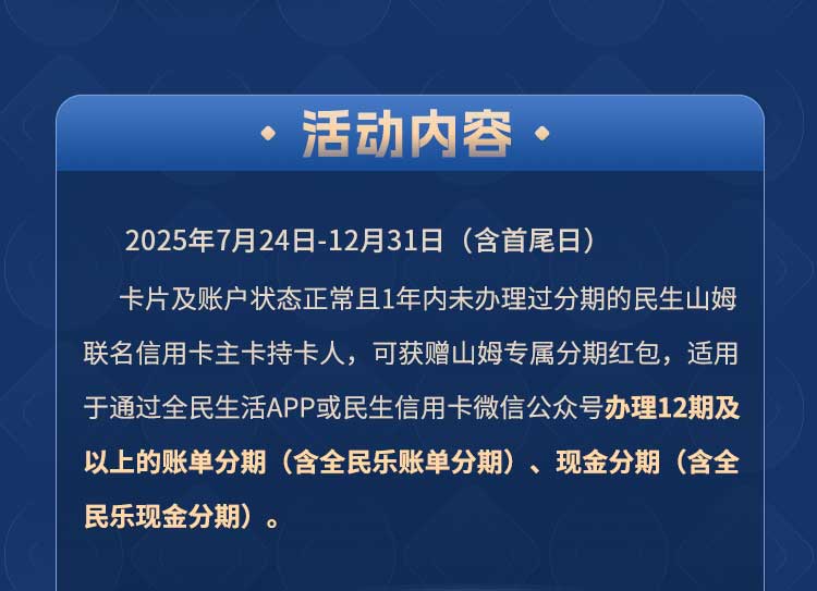 - 2.活动对象:名下卡片及账户状态正常的民生山姆联名信用卡主卡1年内未办理过分期(账单分期(含已出、未出、总账分期、账单分期灵活还款计划、账单分期专享权益)、自由分期、现金分期、全民乐分期(含全民乐-账单分期、全民乐-现金分期、全民乐-自由分期、全民乐-账单分期(提前签约)、全民乐-自由分期(提前签约)、爱心贷、取现分期、随借金)的客户。若持卡人名下有多个民生山姆联名信用卡,则合并计算;附属卡不可单独参与活动,其交易并入主卡计算;账户及卡片状态不正常的持卡人不可参加本活动。