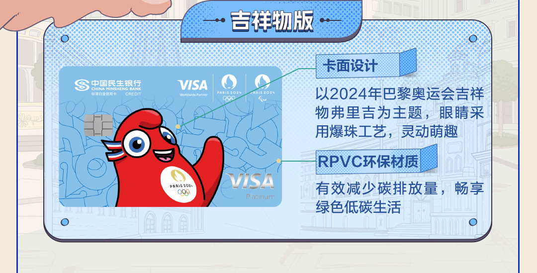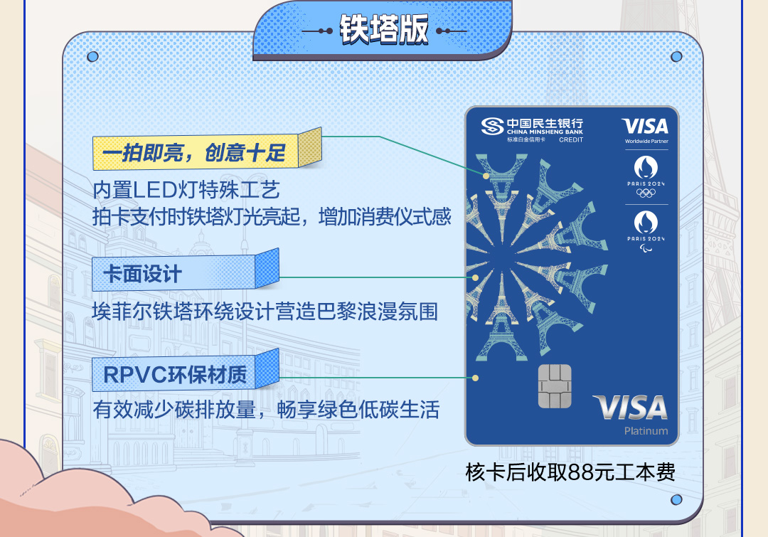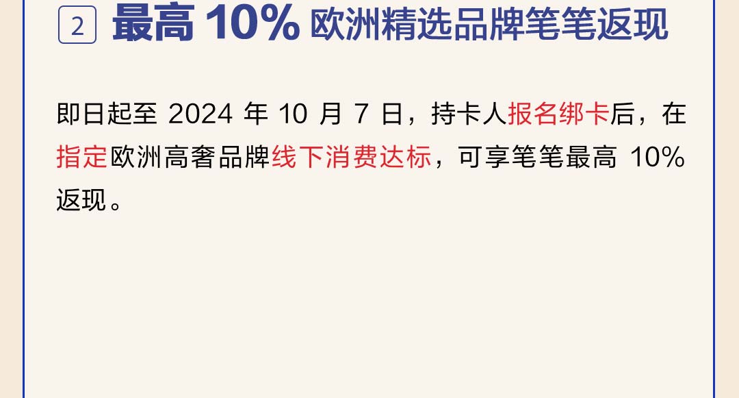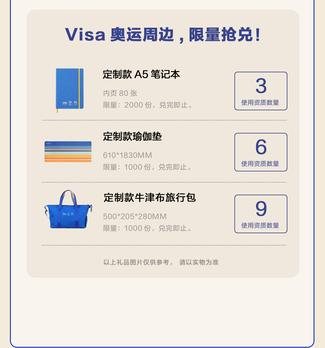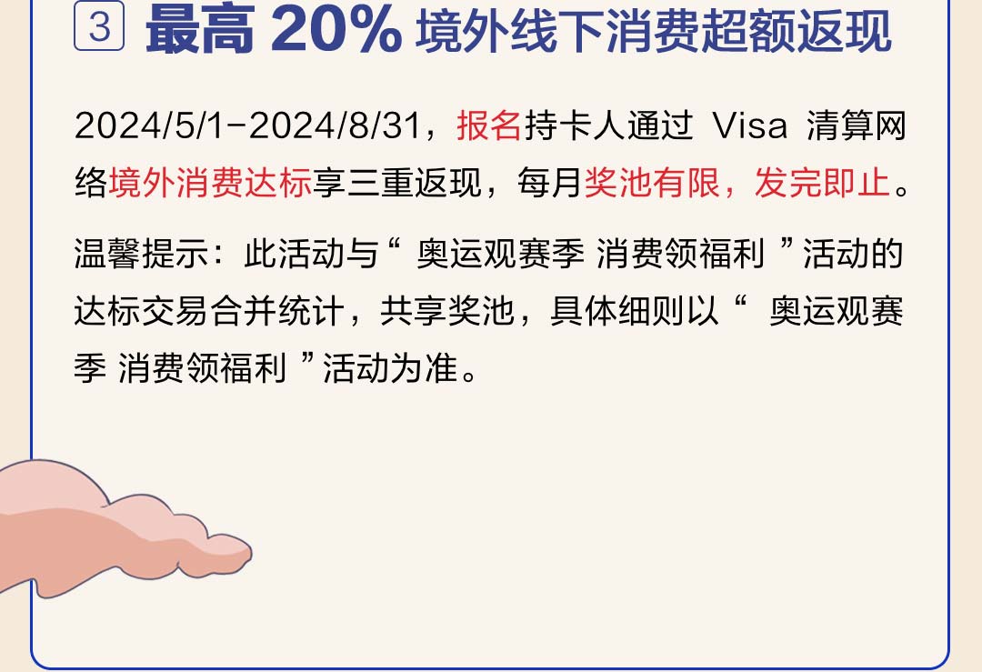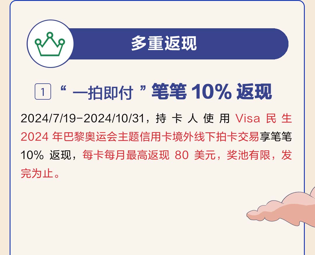 1、2024年7月19日—2024年10月31日,持卡人使用Visa民生银行2024年巴黎奥运会主题信用卡境外线下拍卡交易享笔笔10%返现,每卡每月最高返现80美元。本活动无需报名,每月奖池上限14,500美元,每月按照参与客户单笔消费达标时间先后顺序发放返现奖励。奖池有限,发完即止。